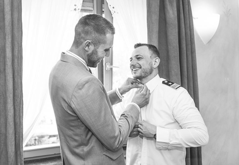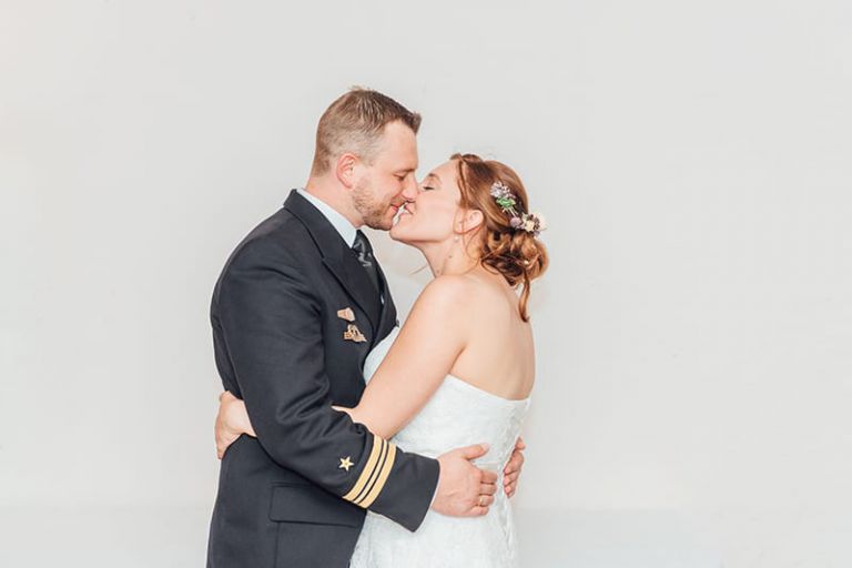 Diese wunderschöne Hochzeitsreportage durfte ich als Hochzeitsfotograf Kassel im schönen Landgasthof und Hotel „Der Grischäfer“ in Bad Emstal fotografisch begleiten. Die fotografische Begleitung meinerseits begann bereits bei dem Schminken und Anziehen der Braut im Hotel vor Ort. Die Möglichkeit, dass man an einem Ort feiern und nächtigen kann, macht den Landgasthof „Der Grischäfer“ zu einer sehr attraktiven Hochzeitslocation in Nordhessen. Die romantisch und rustikal eingerichteten Feierräume verleihen jeder Hochzeit eine besondere Atmosphäre. Die Braut wurde in der Suite zurecht gemacht, wo sie tatkräftige Unterstützung von ihren Brautjungfern und Freundinnen aber auch den treusten vierbeinigen Begleiter erhalten hat. Der Bräutigam hat sich ebenfalls im Hotel vor Ort für den großen Tag zurecht gemacht. Dort hat der Trauzeuge beim Anlegen der Marineuniform tatkräftig unterstützt. Als die Braut nun fertig gestylt wurde, hatten wir die Möglichkeit noch einige Brautportraits in der Suite anzufertigen. Als alle Gäste eingetroffen sind, wurde die Braut von ihrem Bruder zur freien Trauung geführt. Die freie Trauung fand draußen im Innenhof des Landgasthofes statt. Eine emotionale aber auch lustige und sehr romantische Rede hat die Hochzeitszeremonie sehr persönlich gemacht. Dabei sind einige Tränen geflossen. Nach den Glückwünschen und einigen Erfrischungsdrinks ging es in das umliegende Bad Emstal, um das Brautpaarshooting abzuhalten. Als Hochzeitsfotograf Kassel liebe ich diesen Teil der Hochzeitsreportage. Denn das Brautpaar kann endlich seinen Gefühlen freien Lauf lassen. Wir nutzten die wunderschönen Felder und das angrenzende Wäldchen für die Brautpaarfotos. Zurück im Landgasthof konnte die Hochzeitsfeier beginnen. Die Freunde haben als Überraschung einige Musikstücke einstudiert und gespielt.
